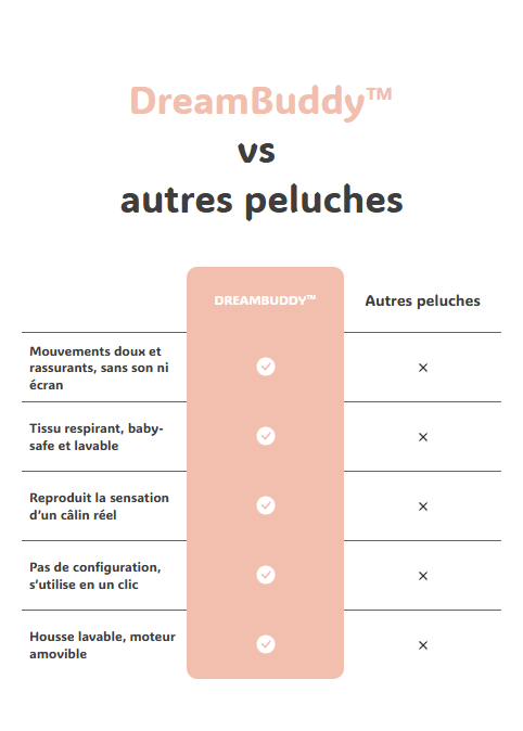 Beaucoup de parents remarquent un bébé plus détendu et un endormissement plus facile. DreamBuddy™ apporte un câlin rassurant qui aide bébé à se sentir en sécurité.
